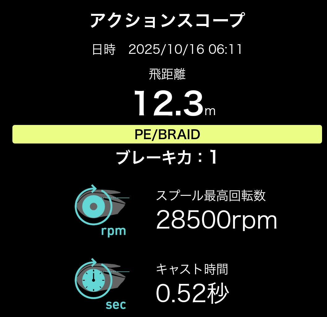 今回、スプール最高回転数を意識して、しっかりとスプールを回すことを考えながらキャストを繰り返してました。力が段々と入っていく中でやはりバックラッシュが発生。バックラッシュ時のスプール最高回転数は28,500 rpmでした。